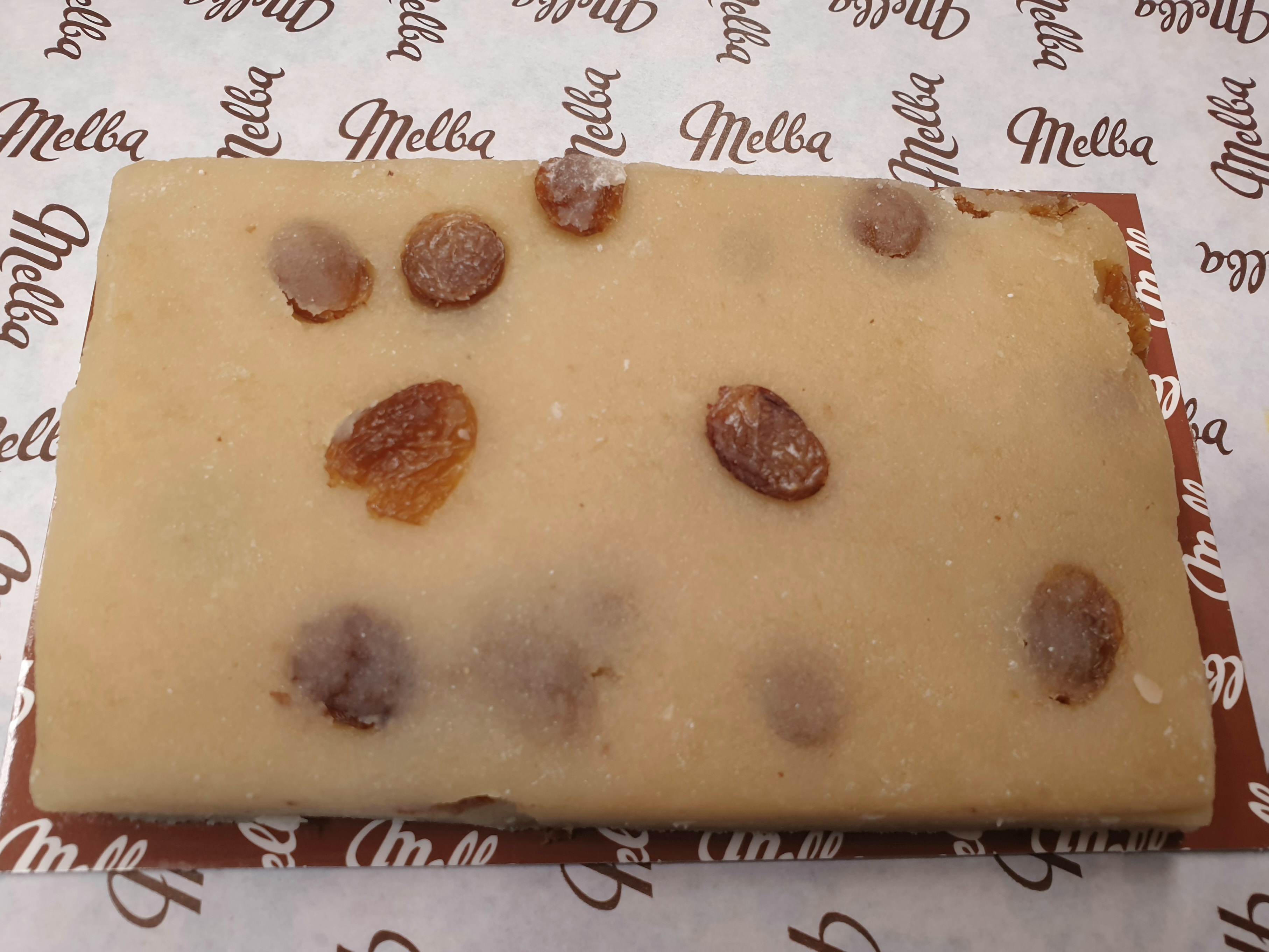 Mazapán de almendra marcona con pasitas sultanas empapadas en ron.